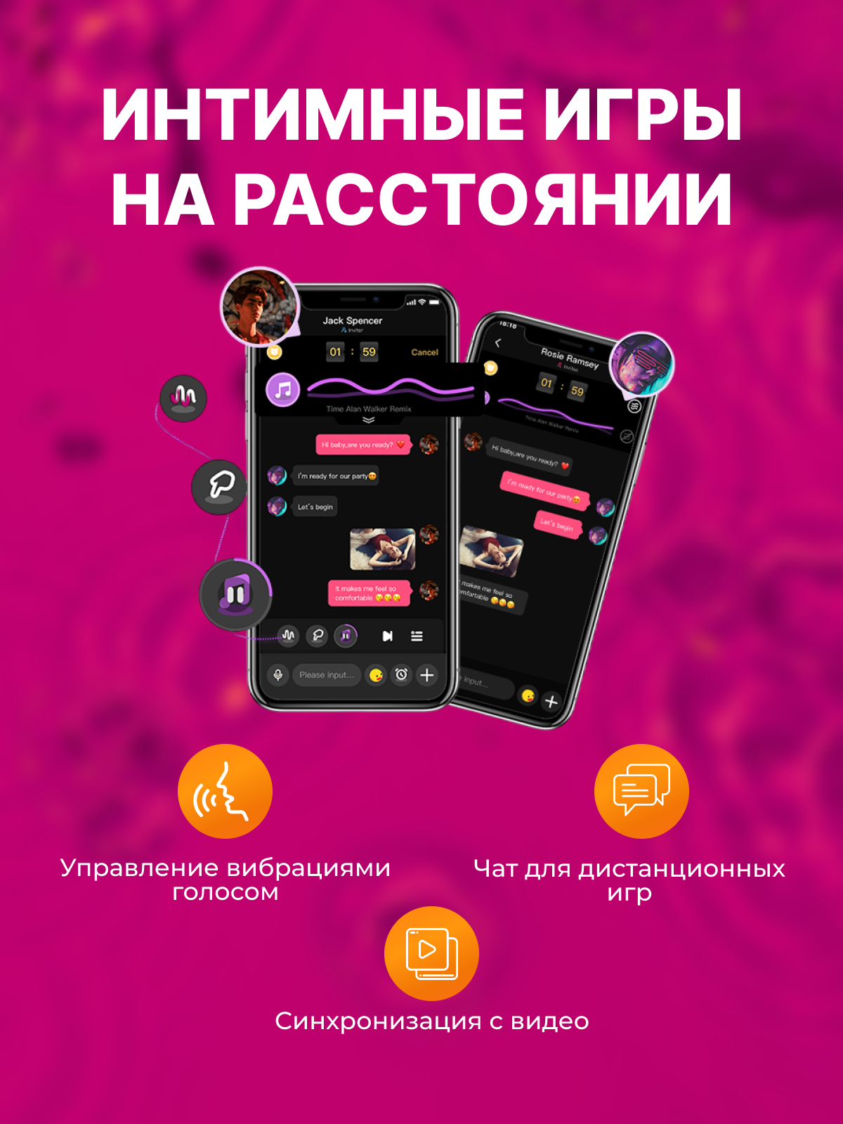 Magic Flamingo Max оснащен регулируемыми вибрациями и функцией мягкого сжатия, которая помогает контролировать интенсивность стимуляции за счет давления на саму игрушку. А с помощью функции Chat Control синхронизируйте устройство партнера с вашим и наслаждайтесь вибрациями вместе, где бы вы не находились.